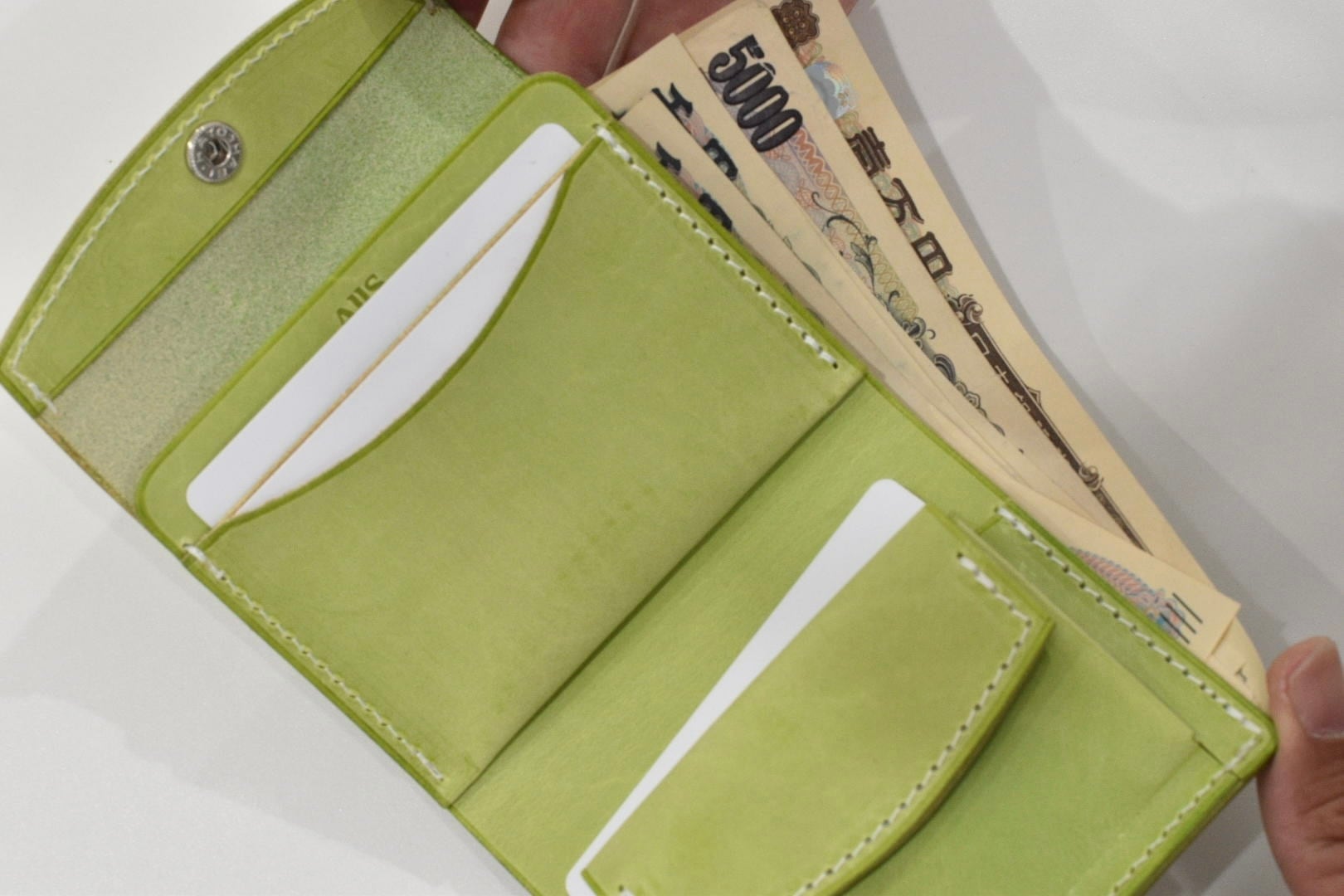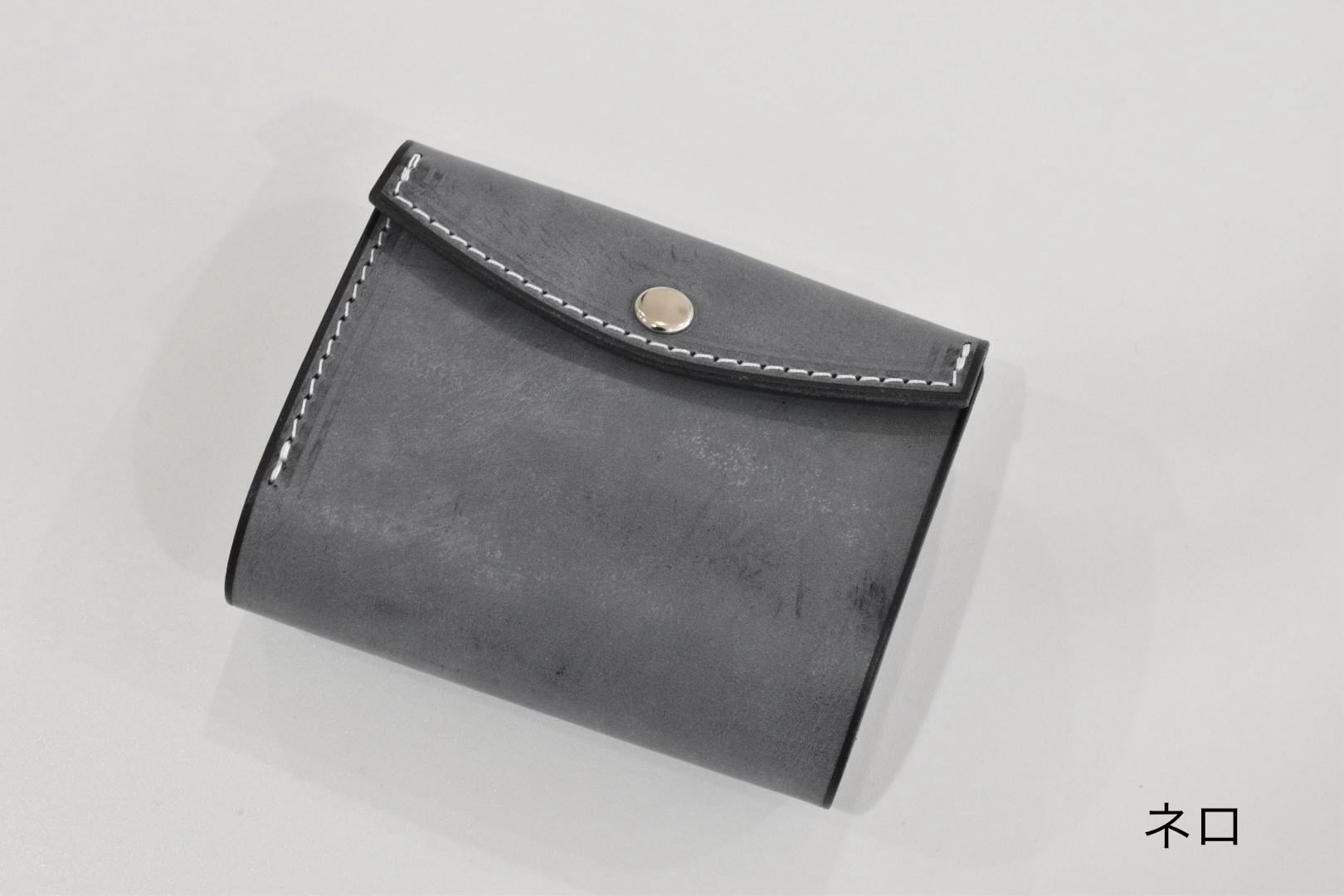 こちらの三つ折り財布は、女性でも片手で握りやすいサイズ感を意識して制作しました。